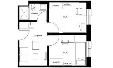 Two Private Bedrooms: Each room features a single bed, desk, lamp, and wardrobe.